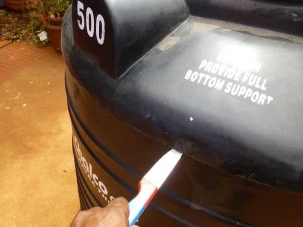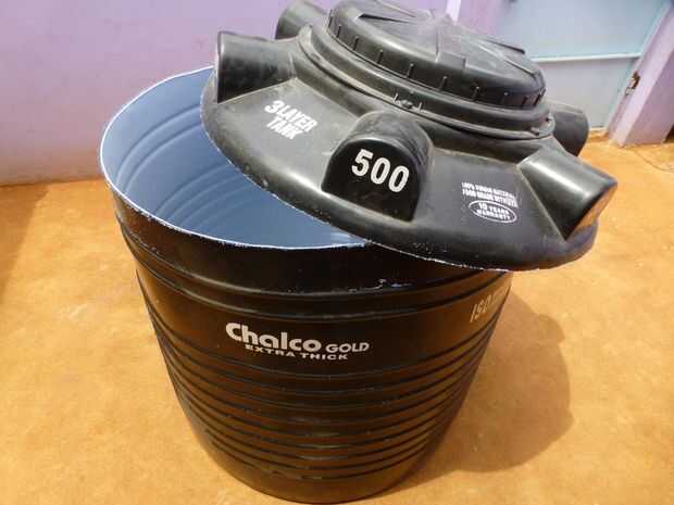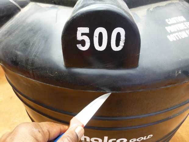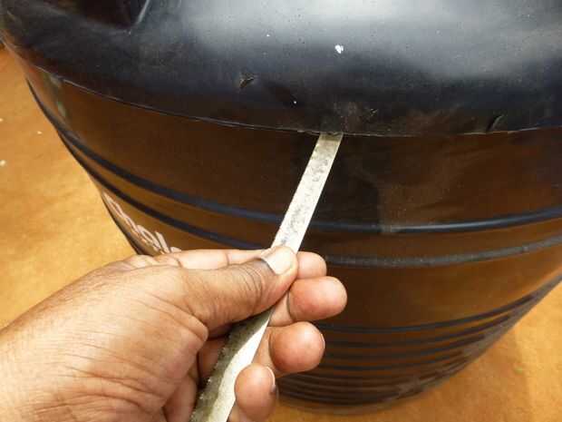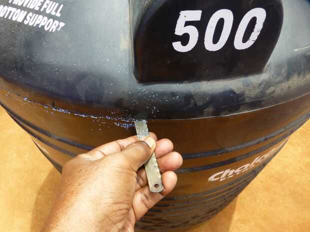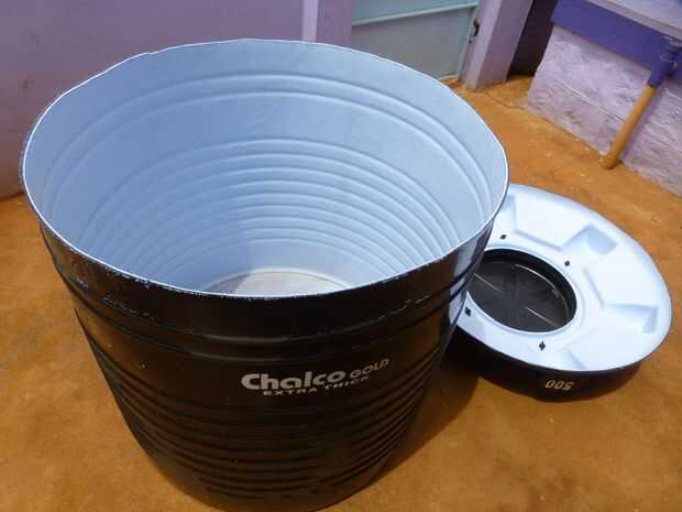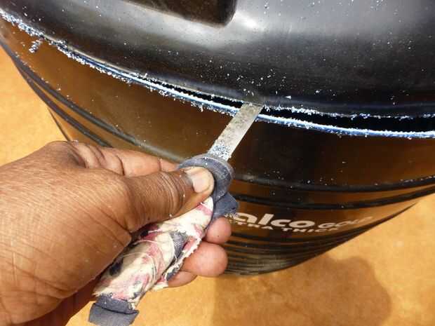 El tanque de 500 litros la capacidad es necesario para cortar en la parte superior. La cresta superior visible se utilizará como línea de guía para cortar el tanque