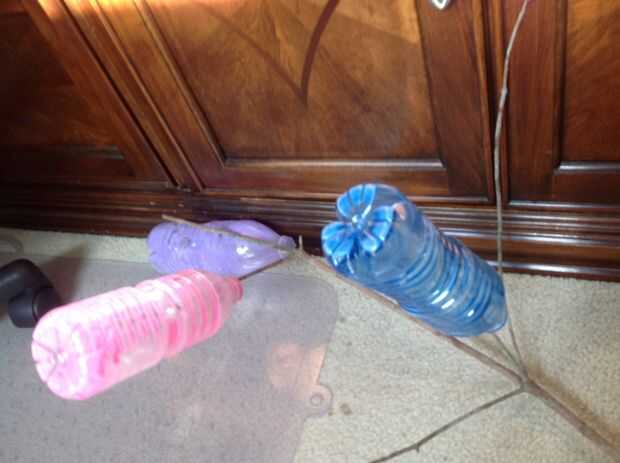Hice tres botellas más y se encendió y ponerlos en mi palo. Se doblaron las ramas un poco, pero no romper, así que estaba bien. Después de ponérselos, decidí que necesitaban un poco más de estabilidad tan el no caerse. Esto es en la que de alguna manera utilizar cualquier pegamento quieres asegurar las botellas en el palo. He utilizado pegamento caliente, pero algunos otros materiales podrían trabajar así.