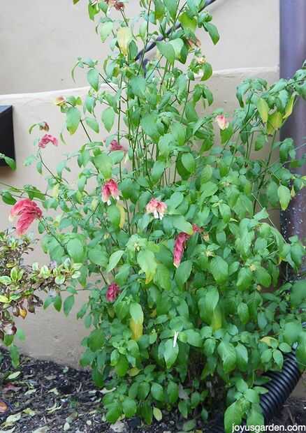 Esta es la planta en enero temprano. Como se puede ver, es leggy, las flores son cada vez más pequeños y más dispersa y las hojas son da vuelta amarillo y caer apagado. Las hojas caerán en temps refrigerador finalmente girar por el camino negro.
