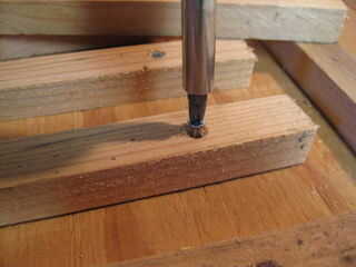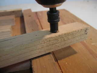Utilice la broca de avellanar para perforar un agujero de aproximadamente 1-1/2" desde cada extremo de cada listón de 1". Estos son probablemente 1" de ancho y 3/4" densamente. Asegúrese de perforar a través de la 1". Avellanado a sólo lo suficientemente profunda como para la cabeza de los tornillos.