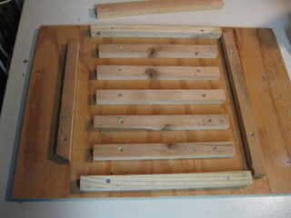 Lugar 6 seis todos los listones de 1-1/8" en la plantilla. Deslícelas por lo que entran en contacto con el listón de S. Colocar otro listón de 1" en el extremo N de los 1-1/8" listones, dejando una separación de 1/8". Tornillo en su posición. Esto completa la plantilla.