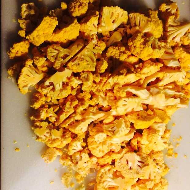 Cortar la cabeza de coliflor y agregar a la cacerola con la proteína y la cebolla. Revuelva para combinar. Si usas tofu o tempeh, debe comenzar a desmoronarse como mezclar la coliflor.