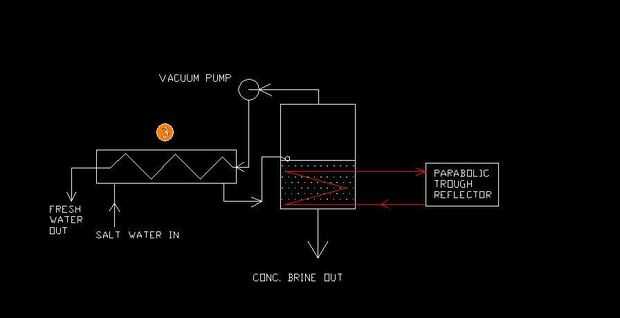 Como funciona la bomba de vacío, el vapor de agua generado es succionado por la bomba y se empuja en un condensador. Esto es donde una persona puede ser creativa. Tenemos vapor de agua y junto con él, mucha de la energía térmica en forma de calor y calor latente. Como el vapor viaja a través del condensador, se expande y enfría llegando eventualmente a forma líquida. También transfiere mucha energía térmica en el condensador. Por supuesto, la clave para un diseño efectivo es eficiencia energética. Así esta energía debería ser utilizado para algo. El agua de mar de entrada a la cámara puede precalentar por el agua de mar que circula a través del condensador antes de tuberías a la sala de la salmuera. Esto asegura que