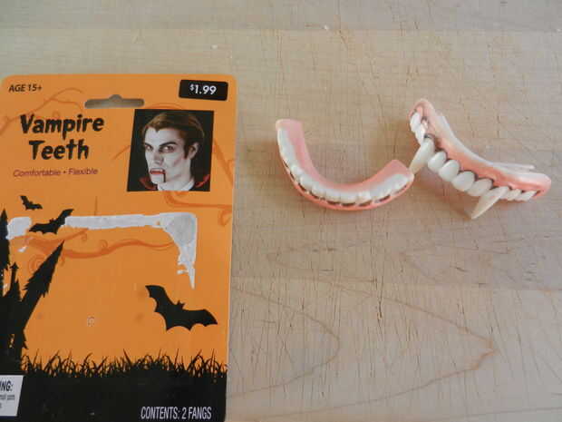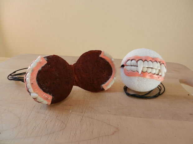 - Con más pegamento blanco y alfileres, pegué los dientes en su lugar. Asegúrese de que pegue los dientes superiores en la parte superior la mitad de la vaina penetrante.