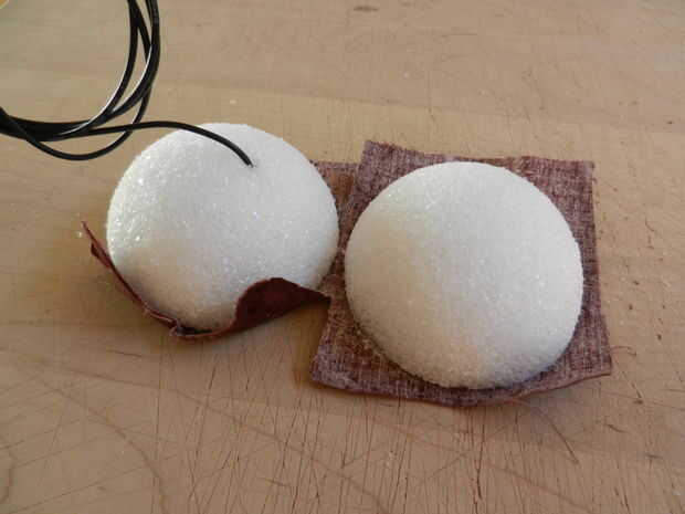 - Después de que el pegamento se haya secado, hice un relieve a la tela para arriba cerca de donde las dos mitades con bisagras. Entonces envuelva los extremos restantes de la tela a las mitades de la bola con pegamento y pernos.