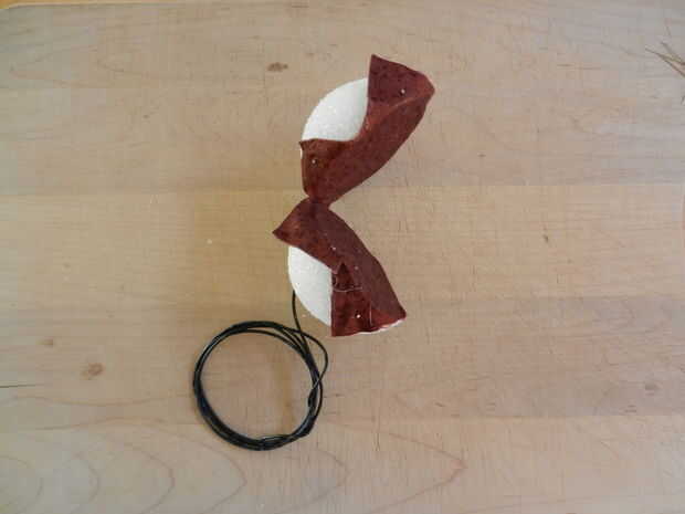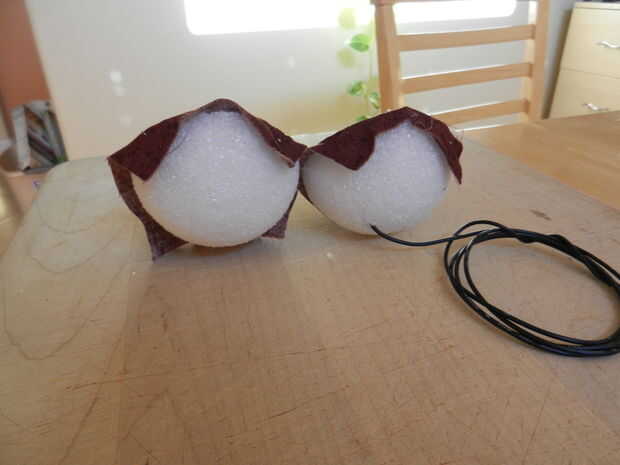 - Con un cable que voy a utilizar como el cable de empuje, que es lo suficientemente larga para ir de la vaina penetrante a la base, hice un lazo en un extremo del cable de empuje y el otro extremo del cable a través de la alimentación el la parte superior de la bola la mitad. El lazo en el extremo del cable de empuje es ser plana entre el corte plano de la bola de espuma de poliestireno de medio y la tela.