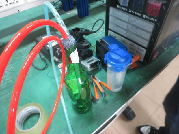 La primera pipa (uno azul en la fotografía) se utiliza para poner agua en la botella. El tubo rojo se utiliza para evacuar el vapor de agua creado.