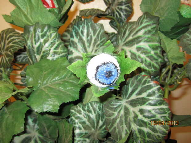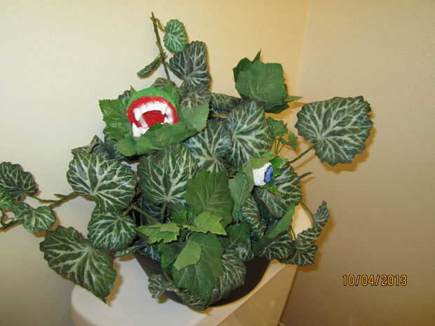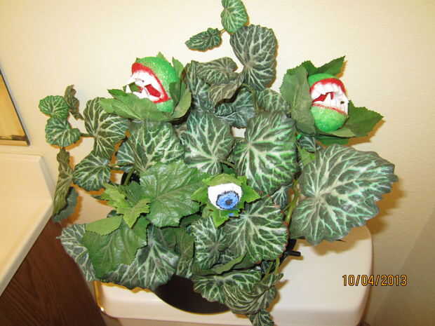 he creado esta planta escritorio en aproximadamente una hora. He utilizado dos bolas de espuma de poliestireno tamaño diferentes (2 para las bocas, 1 para el ojo), pintura, tienda comprar dientes de vampiro, una tienda comprada caldera plástica, follaje falso y un montón de pegamento caliente. Corte las bolas de la boca por la mitad luego cortar un pedazo de ángulo de una de las mitades. Pegados detrás juntos y pintado el interior con pintura roja. Luego pegué los dientes en su lugar (despues de esperar para que crear un poco de la pintura), a continuación pinté el exterior con dolor verde. Luego había atado a un pincho de bambú y pega las hojas alrededor de la cabeza. He pintado el ojo y pegadas las hojas y pincho en el lugar. Finalmente utilicé un trozo de bloque de espuma de estireno dentro de la caldera para mantener todo en su lugar. Ingeniosamente arreglé el follaje falso para que el fondo no podía ser visto.