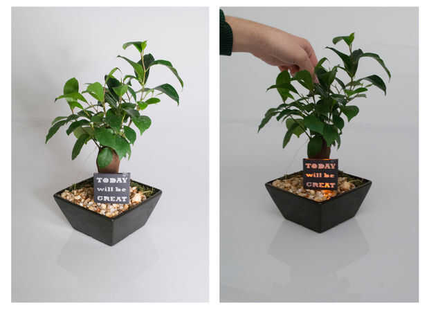 La planta de positividad explora la relación entre los seres humanos y las plantas mediante el uso de viento a la luz de LED para enviar un mensaje positivo.