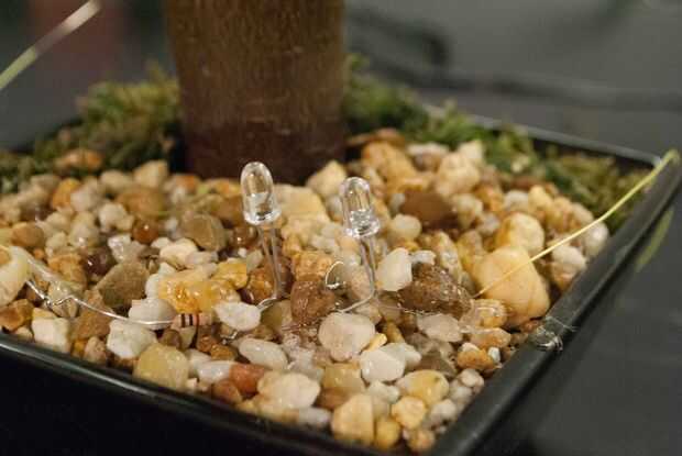 En primer lugar, usted querrá soldadura su 2 LED para su resistencia y colocarlos en la parte delantera de la planta. Esta planta en particular había rocas que pude pegar el leeds bajo las rocas para mantenerlos en su lugar.