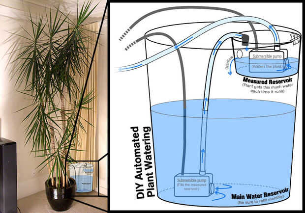 Hice esto para mantener mi olla de dragos árbol vivo mientras estaba fuera de la ciudad por 5 semanas. Es un montón de árboles grandes en una olla pequeña por lo que necesitan ser regadas muy a menudo y no me sentía como en amigo favores por día durante más de un mes. Los paquetes de gel congelado, bolsas de plástico, botellas de 2 litros, planta mechas, etc. no funcionaría porque no sostener o llevar suficiente agua. (El árbol pasa por sobre un vaso y medio de agua al día). Y bombas de tiempo comercial cosas eran caras. Funcionó tan bien lo he mantenido usando incluso cuando no estoy de vacaciones. Ha estado trabajando perfectamente todos los días durante dos años. Como recuerdo llenar para arriba de una vez al mes.