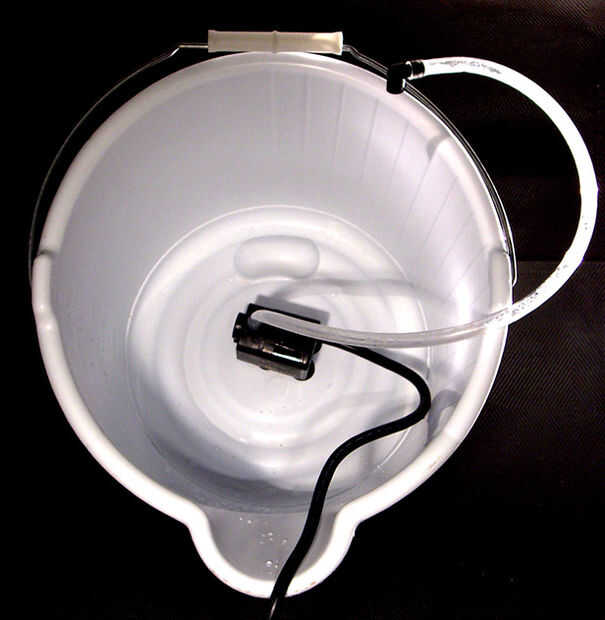 (O lo que tengas. Recipiente grande de plástico estancas. Encontró que mi bombas tenían un tiempo duro, bombeando más de 16" verticalmente, así que asegúrese de que la bomba realmente puede mover el agua fuera de lo que utilizas.