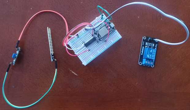 Vamos a comenzar con la sonda de humedad de suelo. Conecte los dos cables de la sonda en el sensor. El orden de los dos cables no es importante. Luego conecte el VCC y GND para el + y - los carriles en la protoboard. Por último conectar la clavija AO en la punta de prueba en el pin A0 en la chispa. Tomaremos ventaja de los valores analógicos de la sonda en la aplicación.