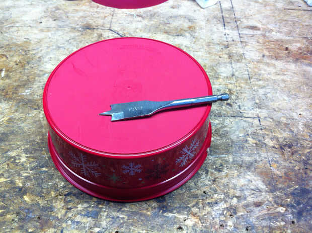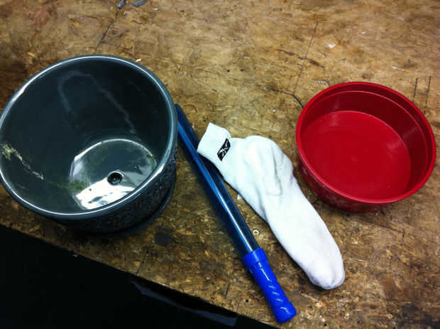 Primero se corta un agujero en el centro del envase de plástico con una broca de pala de 3/4. Próximo había partido de la parte superior del calcetín por la mitad. Pongo el calcetín a través del agujero con el fin de split en la parte superior y el otro extremo lo suficiente como para tocar el fondo de la olla cuando.