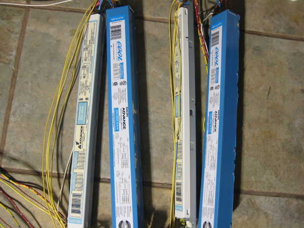 Lastres. Miré los balastos usados en línea y compró dos pares diferentes, así que 4 total de lastres. Tanto vino precableado, tuve que ampliar algunos de los cables y reducir otros para mantener las cosas limpias. Dos potencia 4 Bombillas y dos de potencia 2 bulbos. Los lastres de la 4 lámpara fueron $20 cada uno, 2 lastres de bulbo $15. total de $70.