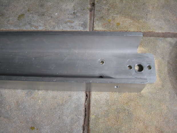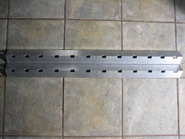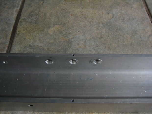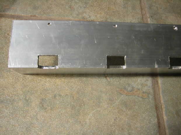 Para terminar el canal, perforado y golpeado ligeramente los agujeros que unirá el extremo de piezas (Foto 1), y también perforado y roscado 8-32 pequeños orificios en el centro de la parte superior cubren (Foto 2). Cuatro agujeros para montar los balastos, tres orificios de 1/2" para los interruptores y el canal está completa. Usted podría notar que mi canal tiene unos agujeros adicionales, esto es debido a que salvó de la yarda de la chatarra.
