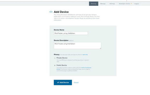 Una vez que se inicio de sesión, en la sección de desarrollo Añadir nuevo dispositivo haciendo clic en (+ Agregar dispositivo), dar un nombre de dispositivo y seleccione el dispositivo como público/privado.