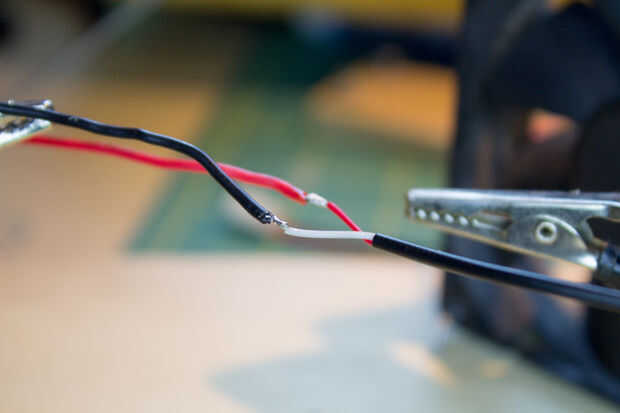 Los cables que iban hasta el motor (o bomba) fueron soldados en así, y alguna tubería del encogimiento del calor fue utilizado para protegerlos.