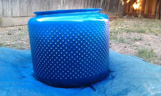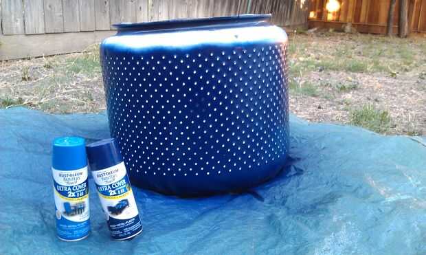 Al día siguiente volcó el tambor y agregó el segundo color en la parte superior. El reto aquí es la pintura lo menos posible – será muy fácil hacer sobre hacer esta parte y arruinar el efecto. Me he centrado en pintar una banda de cuatro pulgadas de alto en la parte superior y eso es todo! Ya que yo estaba usando aerosol pintura en aerosol, el método crea automáticamente un gradiente entre los colores claros y oscuros. De esta manera no tenía que preocuparse por nada de enmascaramiento, pero si intenta activamente para un gradiente, probablemente lo estropeará. Deje que el polvo asentarse donde puede. Si no puede ver la transición del punto entonces lo hiciste bien.