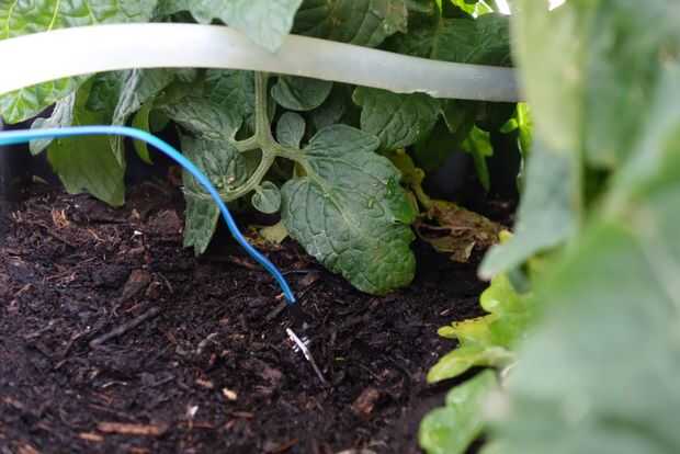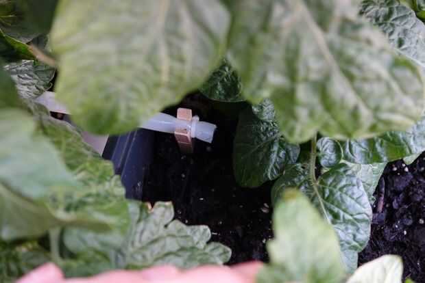 Mis tomates están en dos macetas, lado a lado en mi balcón. Envían la manguera del depósito hasta en tanto pot. Luego corté otro agujero en la tubería, justo sobre el centro de la primera maceta. Sujeta el final de la sede de la segunda olla con una clavija de madera unas más bridas.