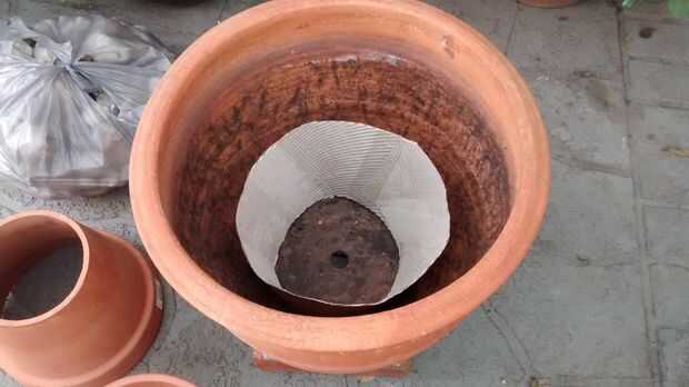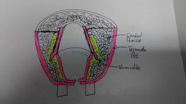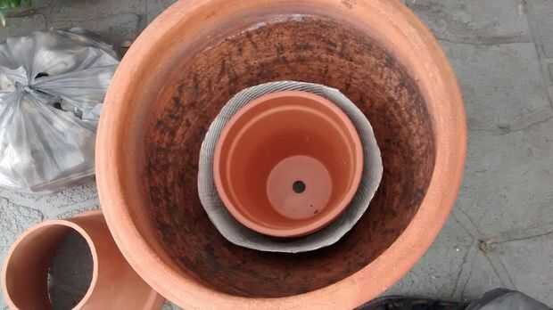 Coloque la olla grande sobre ladrillos, dejando el hoyo sin obstrucciones. Coloque la olla pequeña vertical en la olla grande para coincidir los taladros. Si tienes todas la vermiculita, a llenar el vacío entre las dos macetas con vermiculita. deja la tapa m 30 o así sin llenar. usar guantes y mascarilla al usar vermiculita. Si su uso de la piedra pómez, así, hacer un cono de cartón que es apenas más grande que el bote pequeño. la vermiculita tiene propiedades de aislamiento superior queremos más cerca el calor. programas de cálculo de cono están disponibles en internet. Asegúrese de que usted retire con cuidado la cartulina antes de proceder.