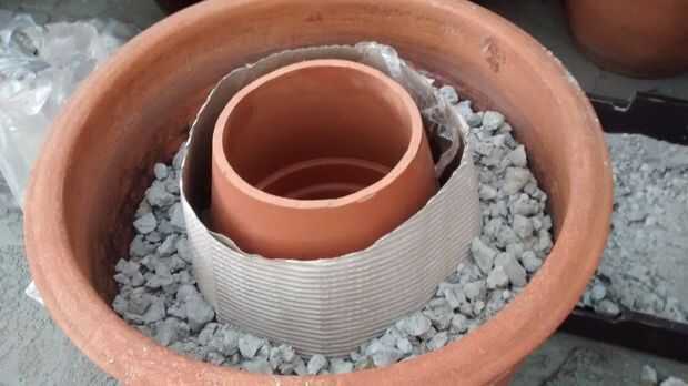 Coloque el medio pote tamaño grande de la abertura hacia abajo en la parte superior del bote pequeño y seguir llenando el vacío que antes, cono o no cono...