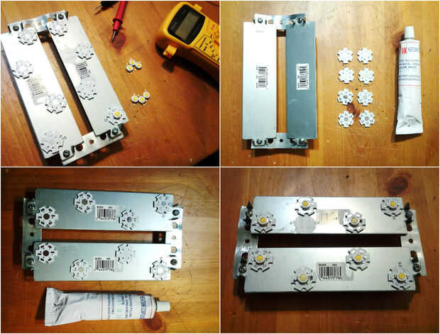 3. pegar los LEDs. en primer lugar usted puede sacar las barras de luz para facilitar el acceso. con cuidado diseño de los LEDs en la dirección de la serie, colocación de una barra a la siguiente y luego salir hacia el conductor. Asegúrese de esperar hasta que el pegamento se seque. mientras espera, usted puede asegurar el interruptor y el conductor en este punto y medida/cortar cable longitud, dividir los extremos - preparándose para soldar. también debe probar cada LED si trabajan antes de pegarlas sobre el marco.
