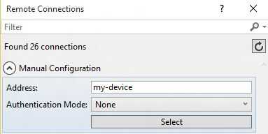 3. en este punto, Visual Studio va a presentar el cuadro de diálogo conexiones remotas. Si has usado con anterioridad PowerShell para configurar un nombre único para su dispositivo, usted puede entrar aquí (en este ejemplo, estamos con mi dispositivo). De lo contrario, utilice la dirección IP de su dispositivo de Windows núcleo de IoT. Después de introducir el nombre/IP del dispositivo seleccione ninguno para la autenticación de Windows y, a continuación, haga clic en seleccionar.