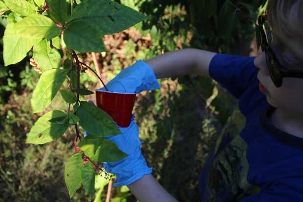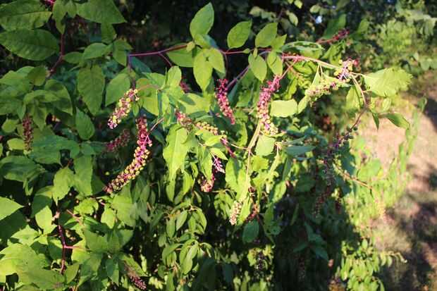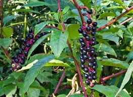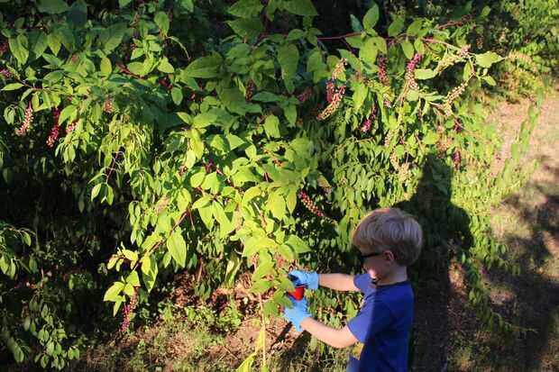 Esto es lo que parece la planta. Usaba guantes de goma para limpiar un poco las manos y tiró las bayas color púrpura, en una taza. Deja los verdes para más adelante. RIA y la diversión.