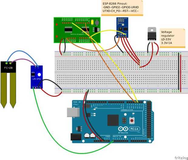 Una vez entendido cómo funciona el código básico, podemos agregar un sensor y hacer que envíe datos a Thingspeak. Elegimos agregar un sensor de humedad de suelo llamado YL-69. Conectar como se muestra en el esquema de Fritzing en este paso y luego pegarlo en el suelo.