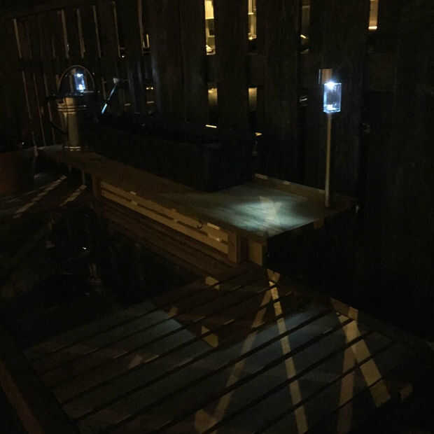 He añadido 2 luces solares LED para el estante superior para la iluminación del paisaje un poco por la noche. Aunque probablemente no voy a estar haciendo mucha plantación de noche las luces solares vean muy bien acentuando el Banco en mi patio.