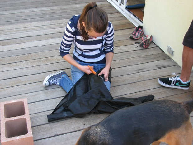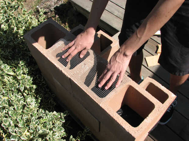Para sostener el suelo en un solo bloque cavidad en lugar de rellenar cada cavidad profunda, acoplamiento de alambre y tela de paisaje se cortaron y se pone debajo de los bloques para mantener el suelo y deje que el agua drene. Anteponer la malla y luego cubrir con la tela.