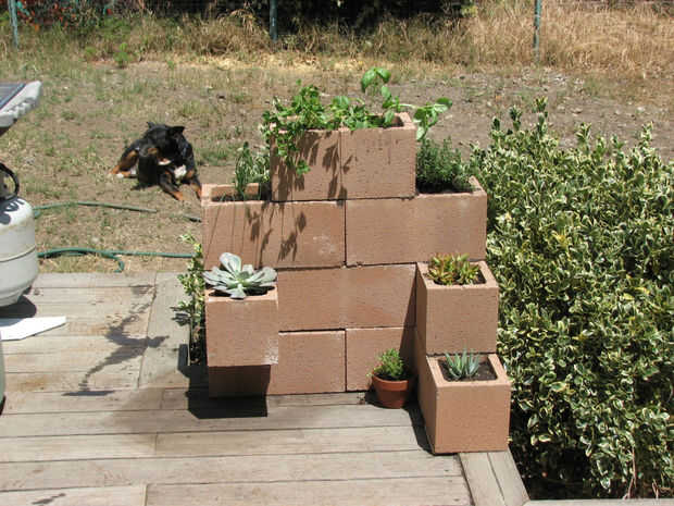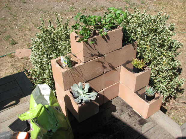 Ahora es el momento para llenar los bloques con tierra y plantar las plantas. Algunos bloques de cemento en el brickyard tenía grandes agujeros luego otros, por lo que puede hacer algunas investigaciones antes de comprar sus bloques.