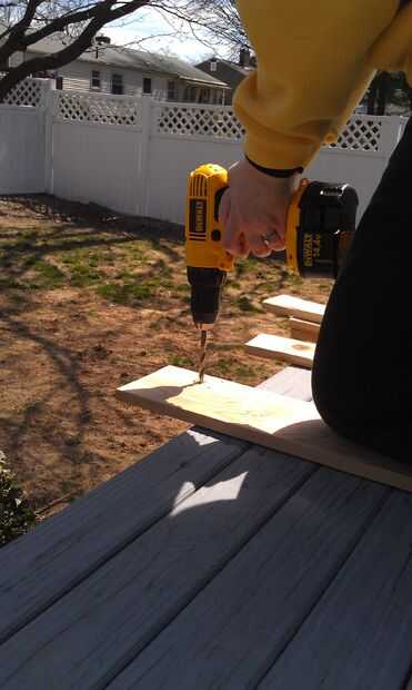 Utilizando un taladro de 1/2" barrena, perforaciones donde se marcan las medidas. Los agujeros tendrán que ir todo el camino a través de estas juntas ya que los tornillos hexagonales también se va en los postes. Asegúrese de que usted perfore los agujeros desde el lado de la tabla que se muestra en el exterior de la maceta hacia el lado que no se muestra. Esto evitará que el tablero de astillas sobre el lado que se muestra.