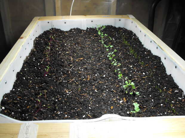 El domingo que hice esto he plantado brócoli, zanahorias, cebollas y remolacha. De izquierda a derecha la remolacha ha llegado y ningún signo de las zanahorias pero el brócoli y las cebollas de primavera ha llegado así. Encontré que para riego usé un césped de 1 galón y rociador del jardín que tengo de Lowes para alrededor $12.  Usando esto en lugar de una regadera perturba la vela menor y por lo tanto deja las semillas donde están plantadas. También da una humedad incluso contenido