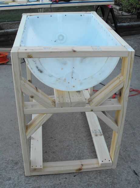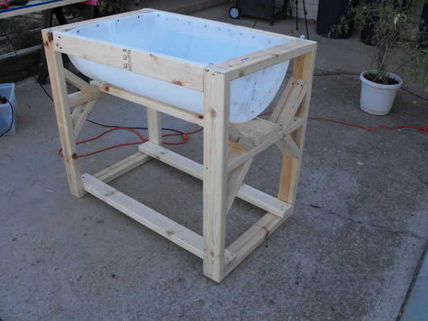 Ahora llegamos hasta el último bit de la construcción. Corte 2 piezas de 2 x 4 42 pulgadas de largo. Estos serán tus llaves de fondo (ver fotos). Cuando la suciedad / macetas mezcla se ponen en (el tambor medio tuvo tres bolsas grandes) pueden tender a lo sólido splay por los extremos por poner la parte inferior cruzada los apoyos en el marco mantiene.