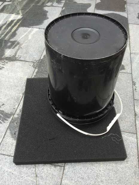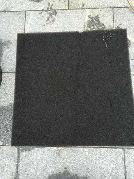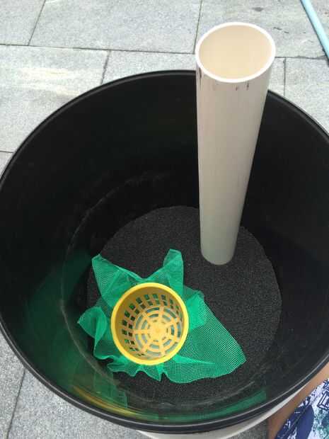 Estamos usando esponja de filtro utilizado como filtro del acuario para crear la capa entre el suelo y el agua del embalse. La esponja del filtro es fácil de encontrar y duradero en ambientes húmedos.