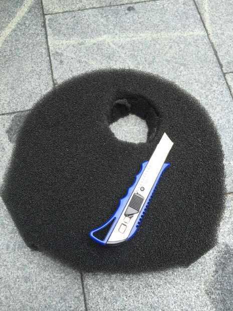 Coloque el pote neto y dos tapas sobre la esponja y corte el agujero para el pote neto con cúter.