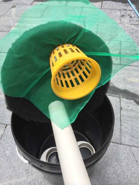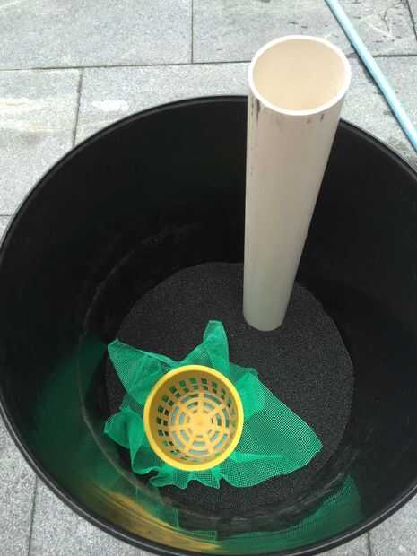 Instale la esponja con el pote neto y tubo riego instalado. Presione la esponja hasta el fondo del cubo contra los casquillos de la pipa.