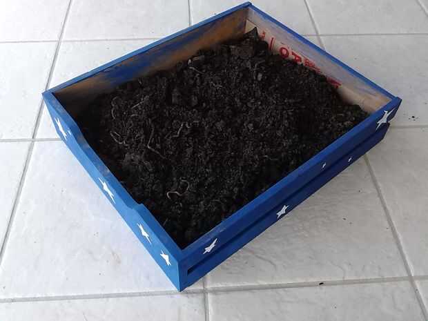 Estoy agregando gusanos al suelo así que puse un pedazo de cartón en la parte inferior de la caja. Esto evitará que las lombrices escapen a la parte inferior de la caja. Entonces añadí el suelo a la caja. Usé el suelo de mi jardín y mi hoyo de composta.