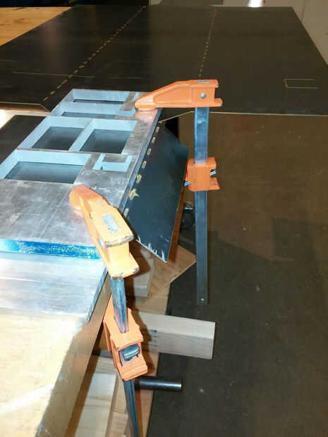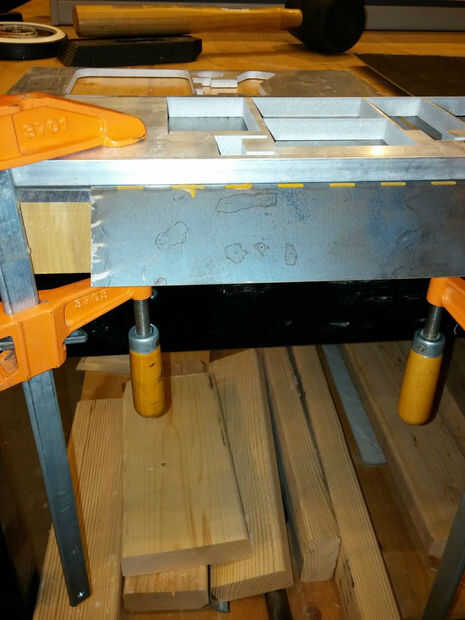 Una vez que las piezas se cortan, puede empezar a doblar las pestañas. Empecé a hacer uso de un freno de dedo, pero el rango de movimiento era bastante limitada: tan pronto como las pestañas comienzan a doblar barren en la manera del freno. Así que, decidí hacer uso de una pieza rígida de metal y algunas abrazaderas.