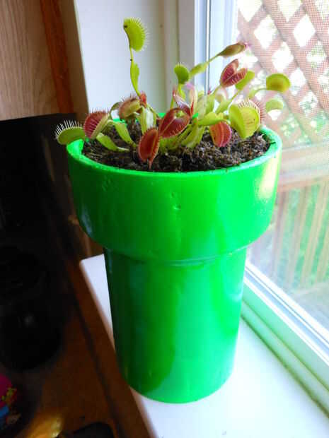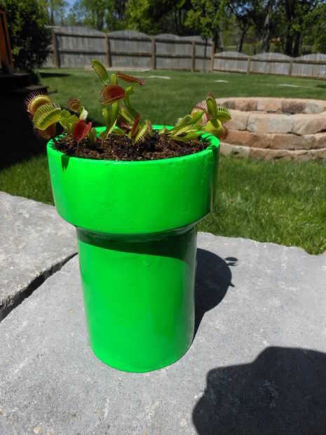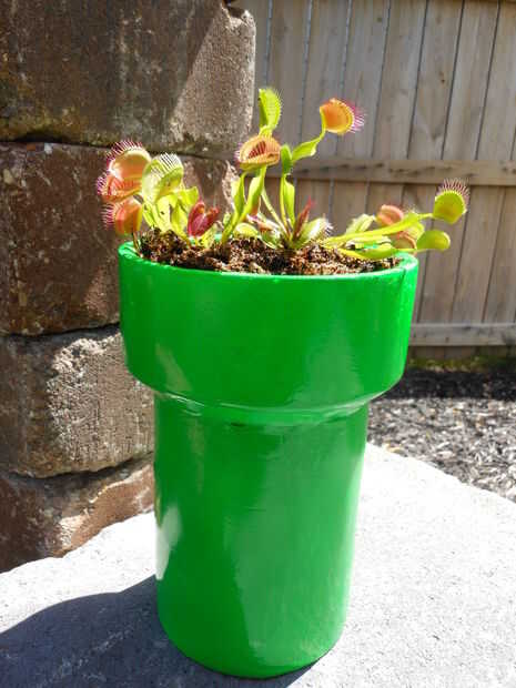 plantador temática A Mario Bros.  Podría llevar a cabo cualquier planta pequeña, pero para efectos de la genialidad, he decidido llenar con mosqueros de venus. Hecho de materiales baratos y fácilmente disponibles, este sería un fin de semana perfecto proyecto para soop tu perfil jardinera.