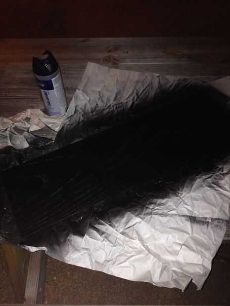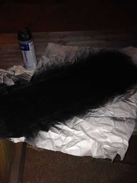 Colocar su periódico. Tomar la madera y la arena con el bloque de lijado y el una sola capa de pintura de pizarra en el frente y todos los bordes. Espere aproximadamente 1 hora y voltear. Pintar la parte de atrás y dejar reposar una hora.
