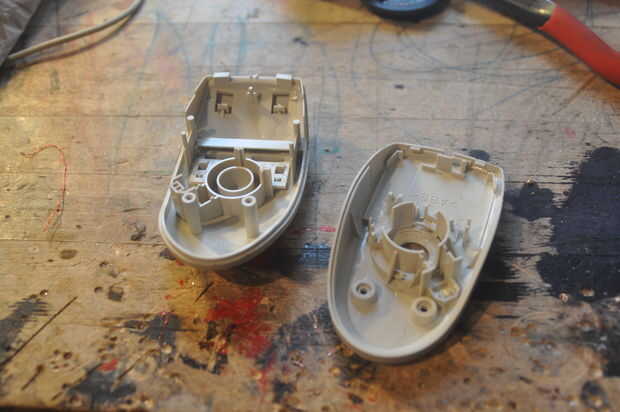Esto debe ser bastante simple, en los ratones más los tornillos se encuentran en la parte inferior.  Sólo aflójelas y ponerlos a un lado.  Necesita estas más adelante.  Dentro verás una placa de circuito, deberá sacar esto.  Mina sólo se deslizó hacia fuera y no fue conectado de ninguna manera.  Sacar la bola y lo o tírela.  Ahora usted tiene dos mitades de un ratón.