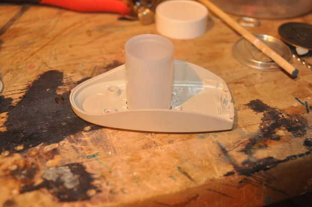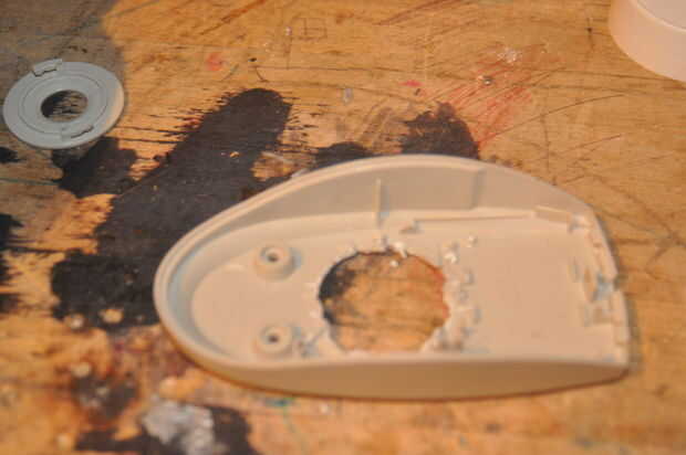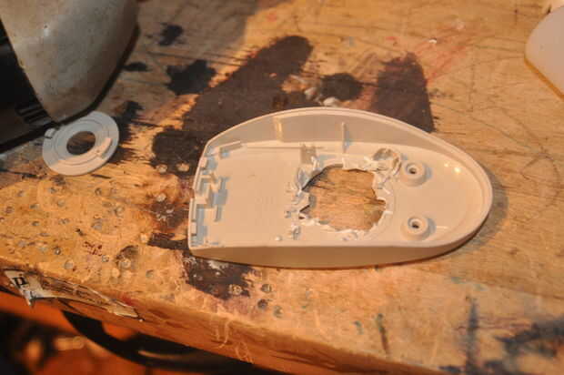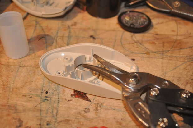 El real es un frasco de película, y este bote de película va a necesitar un lugar para ir, así que decidí colocar minas donde la bola fue antes de que sacó.  Como se puede ver la zona donde se encontraba el balón tiene un montón de plástico alrededor de él que impide que el cartucho de la película de ir pulg que usted tendrá que tomar distancia para que el cartucho de película se ajuste.  Primero probé usando un taladro, pero que no por lo que terminé todo el plástico con unas tijeras de corte. El área probablemente será bastante duro, por lo que quiere a la arena.  En la parte inferior que tienes que agrandar el tamaño del agujero hasta la película bote hace un ajuste apretado.  Para ello a la parte superior e inferior de este ratón.