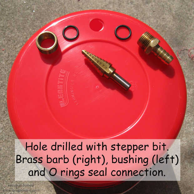 El primer paso para crear el sistema por goteo será crear el depósito de agua. Se utilizará un cubo de polietileno estándar; sin embargo, debido a gravedad abastecerá la presión y la línea de la manguera no esté cebada con agua cuando se llena, será necesario un orificio perforado en la parte inferior de la cubeta y conectado a una manguera con suficiente mitigación de fugas. Esto se logró con una escalonamiento broca con un diámetro final de 3/4", un reborde de púas de latón con roscas, una cara correspondiente transporte y dos juntas.