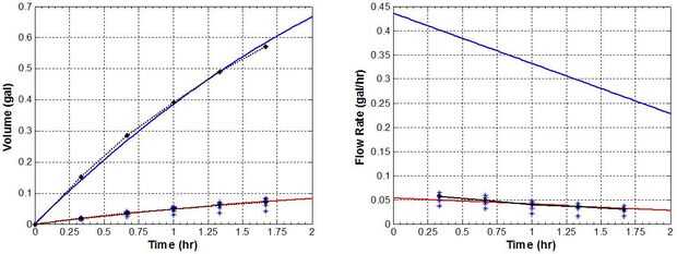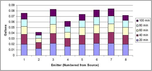 El experimento anterior se llevó a cabo con este sistema, con el volumen de agua medido cada 20 minutos. Los resultados se muestran por encima y apoyan la ecuación de Bernoulli con fricción despreciable. En la segunda figura, las líneas rojas representan cada emisor individual y las líneas azules representan el sistema de competición. La última figura muestra la distribución del volumen de agua medido de cada emisor. Mientras que el emisor 2 es inusualmente baja (tal vez debido a una obstrucción parcial), los otros emisores parecen ser algo uniforme. Si no estás satisfecho con la prueba de uniformidad, puede intentar destapar cualquier obstrucción potencialmente emisores mediante lavado de agua a través del tubo de PVC y trató de forzar el aire a través de los emisores con la boca (puede parecer extraño, pero funciona). Si usted prueba una vez más y la uniformidad no ha cambiado, se pueden taladrar potencialmente emisores adicionales.