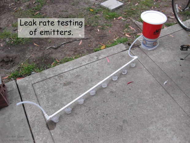 ahora puede crear una prueba simple para determinar si están alcanzando una tasa de goteo uniforme. Cortar dos tramos de tubería de polietileno de 0.5" de diámetro y coloque cada uno de los adaptadores de Nylon adquirió. Los adaptadores de Nylon también deben atornillarse en los hilos de las esquinas de PVC de 90 grados. Conecte el extremo opuesto de uno de los tubos al cubo que creó anteriormente y suspender un poco arriba del tubo de PVC. Asegúrese de que los emisores están hacia abajo y luego se puede suspender la tubería de PVC sobre un número de tazas, cada una orientada por debajo de uno de los emisores, como se muestra en la figura anterior. Si sólo te preocupas por la uniformidad, poner un poco de agua en el balde, luego dejarlo hasta que acabe (Nota: Asegúrese de que usted vea agua en el tubo de lejos que es expuesta al aire, se necesita levantar el balde por un momento purgar el aire del sistema). Después de cierto tiempo, después puede quitar el sistema y medir el volumen de las tazas.