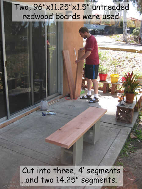 Mientras que el cedro era el material de construcción previsto originalmente, no era disponible en el momento de la construcción. Más consejos de redwood ideal zona tenían dimensiones de 8' x 11,25" x 1.5". Se compraron dos tableros y ambos fueron cortadas por la mitad en segmentos de 4'. Tres segmentos fueron utilizados para la base y los dos lados largos de la sembradora, con los restantes dos extremos cortos de la jardinera a cortar desde el segmento restante de 4'. Estos segmentos fueron cortados con una longitud de 14,25", dejando a 33.75" restantes.