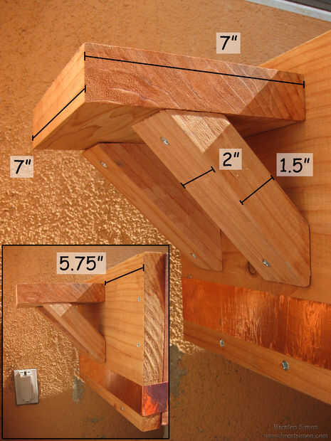 Con cuidado Mida esta distancia debajo de la altura del contenedor y márquelo. Alinear la parte superior de la plataforma con esta marca y compensar a la parte posterior de la maceta utilizando las dimensiones en la figura anterior. Sujete el estante todavía y uno de los tres agujeros guía de taladro, igualmente espaciadas a lo largo de la bandeja y llenarlo inmediatamente con un tornillo de madera de 3" #10. Esto debe llevar a cabo la plataforma, en su mayor parte, pero todavía necesita sostenerlo cuando perforar e insertar los dos tornillos restantes.